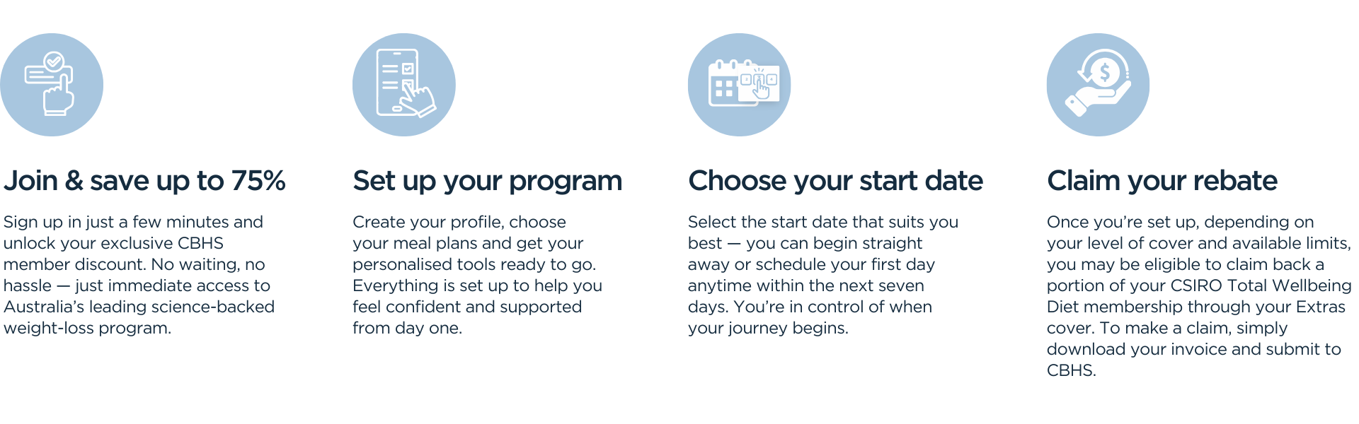 That's why when you join today, you'll not only save up to 75% off, as a CBHS member, you may also be able to claim back a portion of your CSIRO Total Wellbeing Diet membership through your Extras cover, depending on your level of cover and available limits.